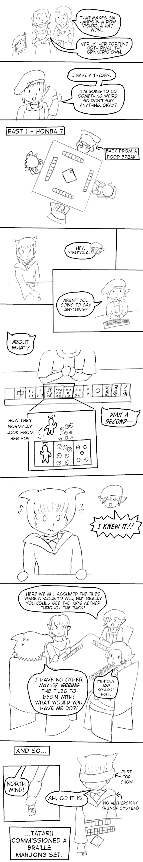 Panel 3: They’re all sitting at a mahjong table with Y’shtola. Y’shtola is East; Tataru is West.